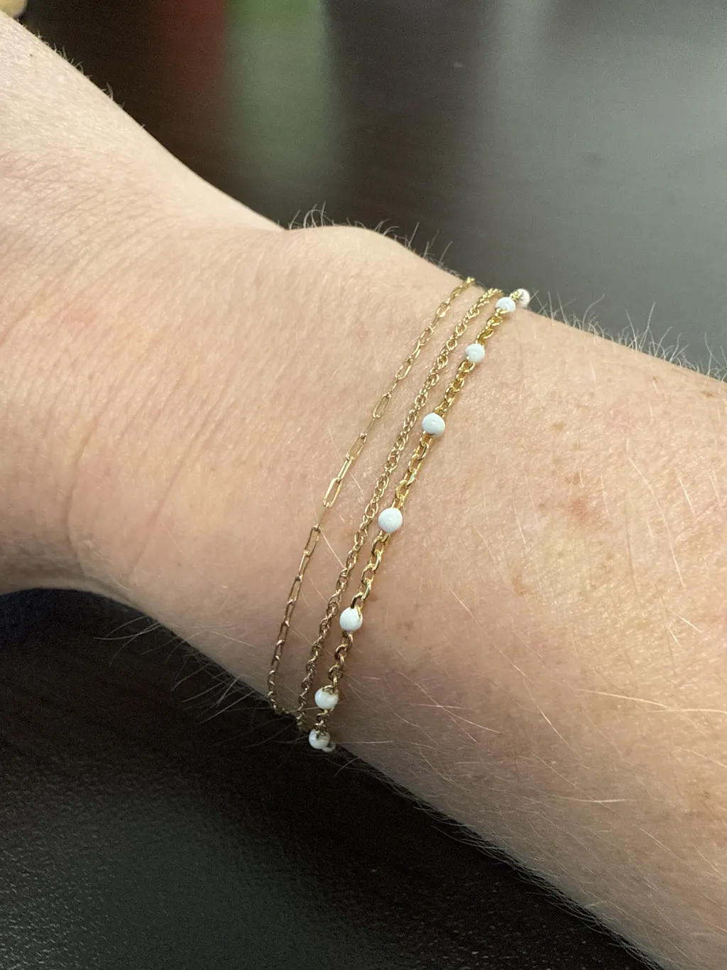 I’ve had this bracelet approximately 2 weeks, and I have not taken it off! It looks perfect with my 2 gold permanent bracelets. It has gone through multiple Orangetheory classes and just daily life. I love the pop of white too! I’m absolutely obsessed, and hope I can wear it forever!